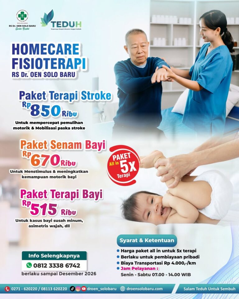 Kini layanan terapi profesional hadir langsung di kenyamanan rumah Anda. RS Dr. OEN SOLO BARU menyediakan layanan Homecare Fisioterapi yang dirancang khusus untuk mendukung pemulihan mobilitas pasca stroke serta stimulasi tumbuh kembang bayi secara intensif dan personal.