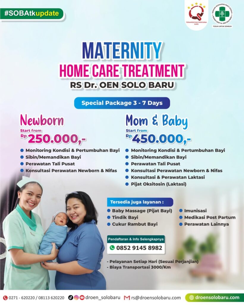 Layanan Homecare Pasca Persalinan dari RS Dr. OEN SOLO BARU memberikan perawatan yang penuh perhatian dan profesional. Mulai dari konsultasi perawatan new born, nifas hingga layanan kesehatan ibu dan bayi lainnya.