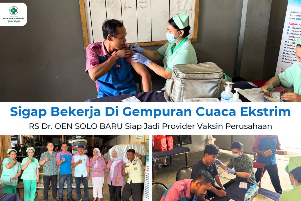 RS Dr. OEN SOLO BARU menegaskan kesiapan untuk memberikan pelayanan vaksinasi, baik di lingkungan Rumah Sakit maupun langsung di lokasi perusahaan (onsite service), demi mendukung produktivitas dan kesehatan pekerja. Layanan imunisasi dan vaksin dari RS Dr. OEN SOLO BARU dapat diketahui melalui Klinik Ibu dan Anak, sedangkan kerjasama kemitraan akan dibantu melalui tim Hubungan Masyarat RS.