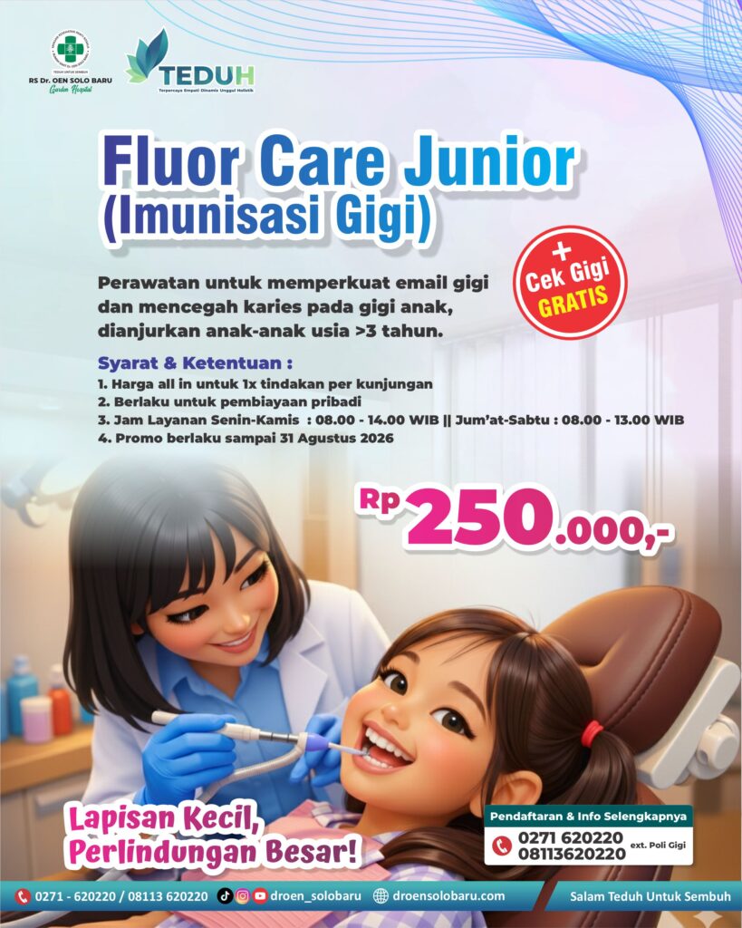 Kesehatan gigi si kecil adalah investasi masa depan. RS Dr. OEN SOLO BARU menghadirkan layanan Fluor Care Junior, sebuah tindakan “imunisasi gigi” yang dirancang khusus untuk memperkuat lapisan email dan mencegah timbulnya karies sejak dini. Berikan perlindungan maksimal agar senyum buah hati tetap sehat dan cemerlang! Detail Layanan & Harga : Harga Promo β Rp […]